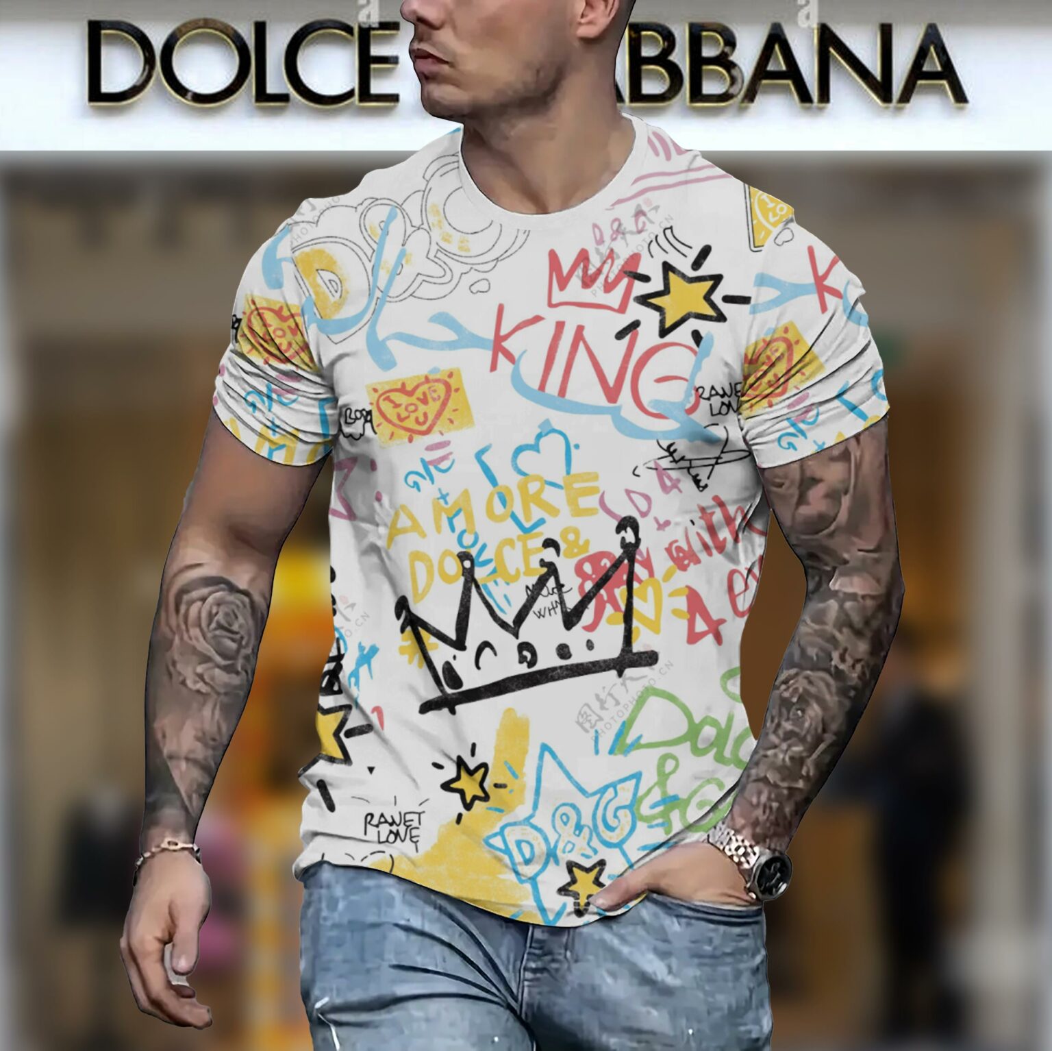 Quarter-turned body to eliminate the center crease. The design is printed with new age printing technology, direct to garment. It is printed with a water – soluble and eco – friendly ink.